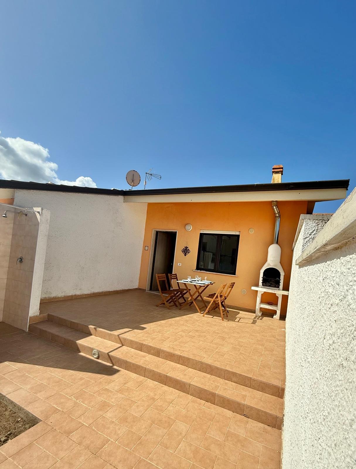 Front of Property – Large Terrace overlooking garden & Pool – Outside shower & BBQ.
