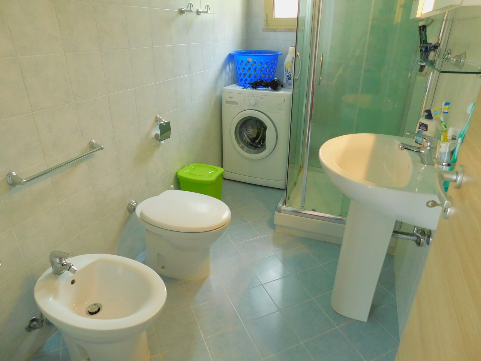 Family Bathroom – Shower, sink, toilet, bidet & washing machine.