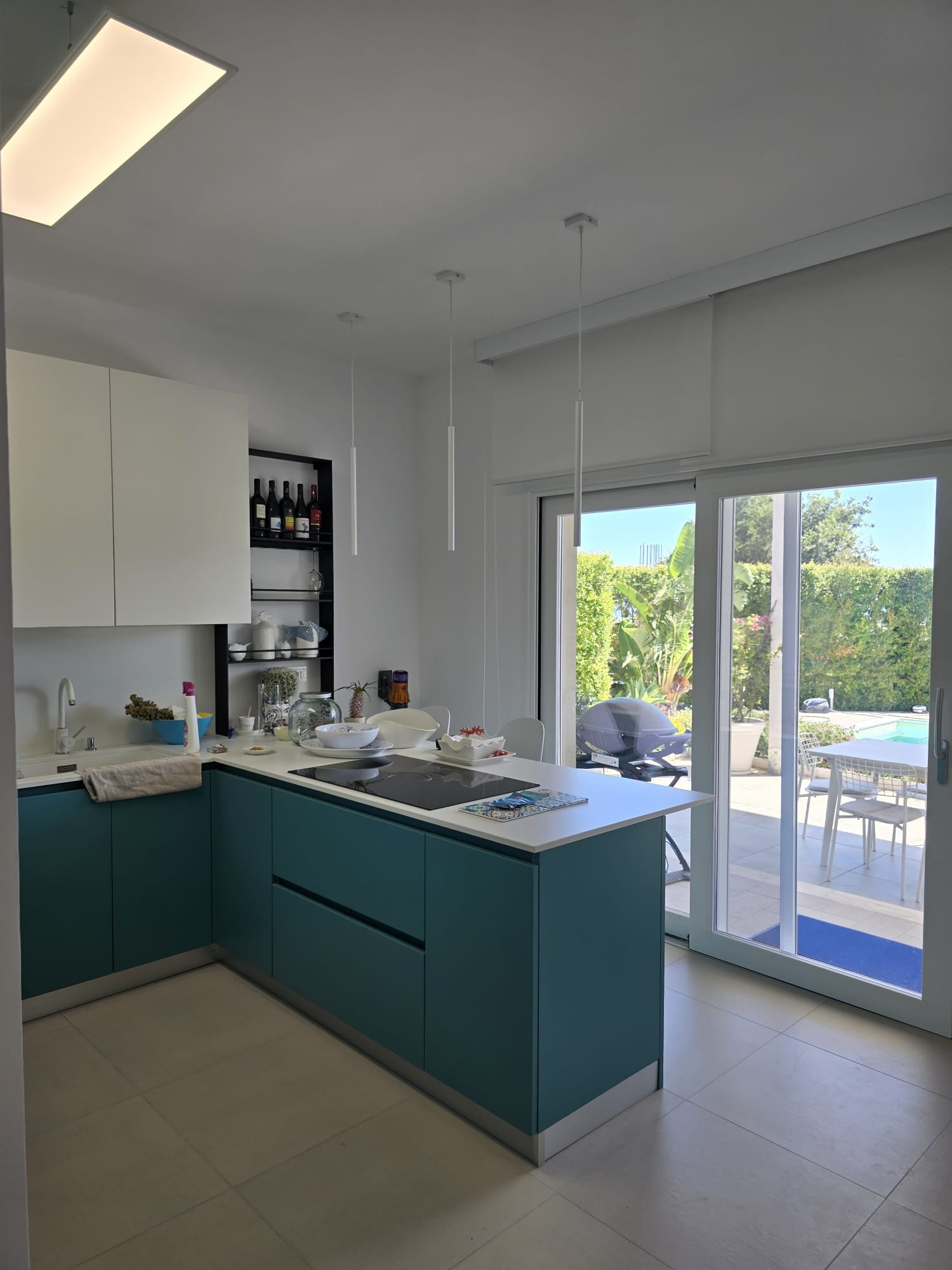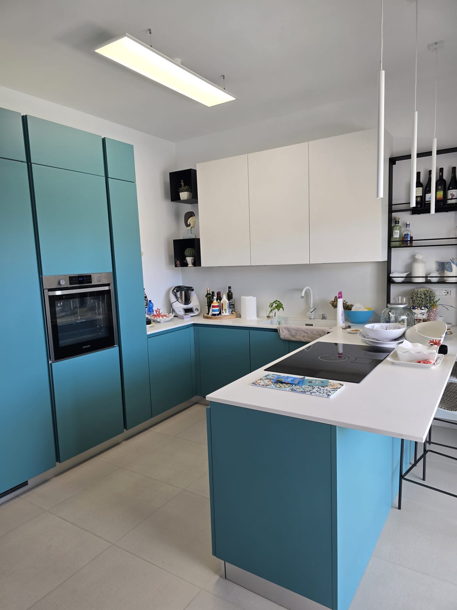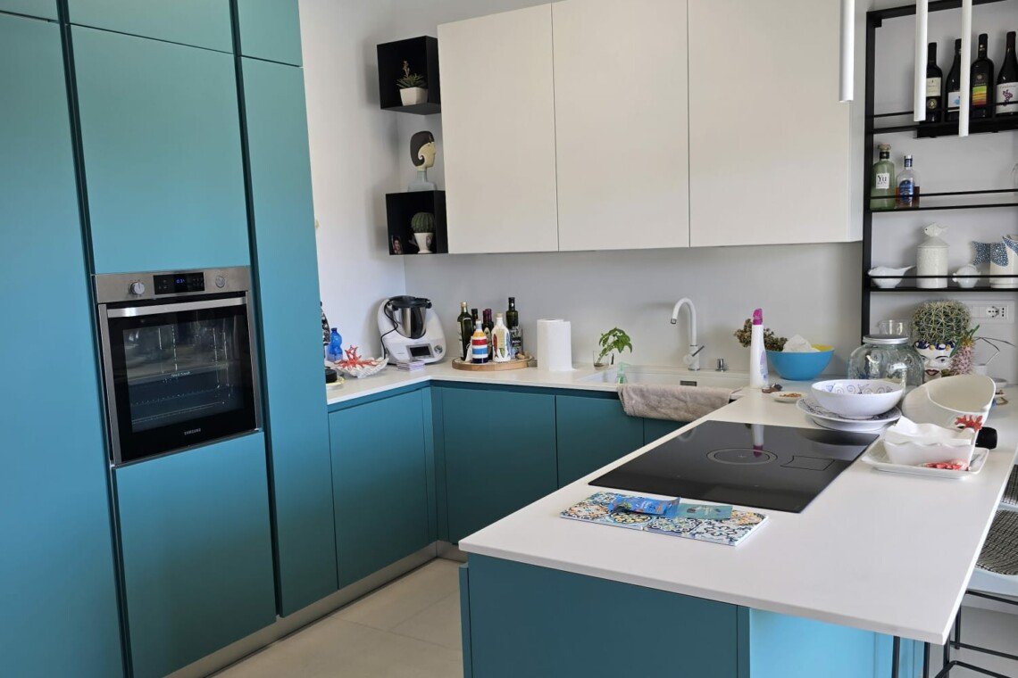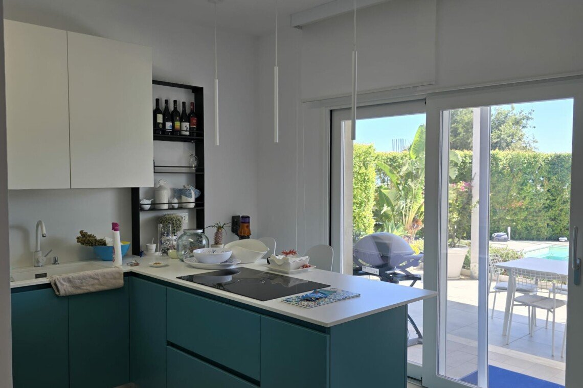 A standout example is the custom-designed blue kitchen, crafted by a local artisan brand, inspired by the stunning sea tones of nearby Tropea. This signature hue flows elegantly throughout the home, tying each space together in a harmonious palette reminiscent of coastal southern Italy.